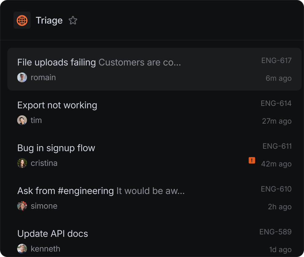 Manage incoming requests from a shared triage inbox.Review, prioritize, assign, and update each issue without ever switching back to Slack or Email.
