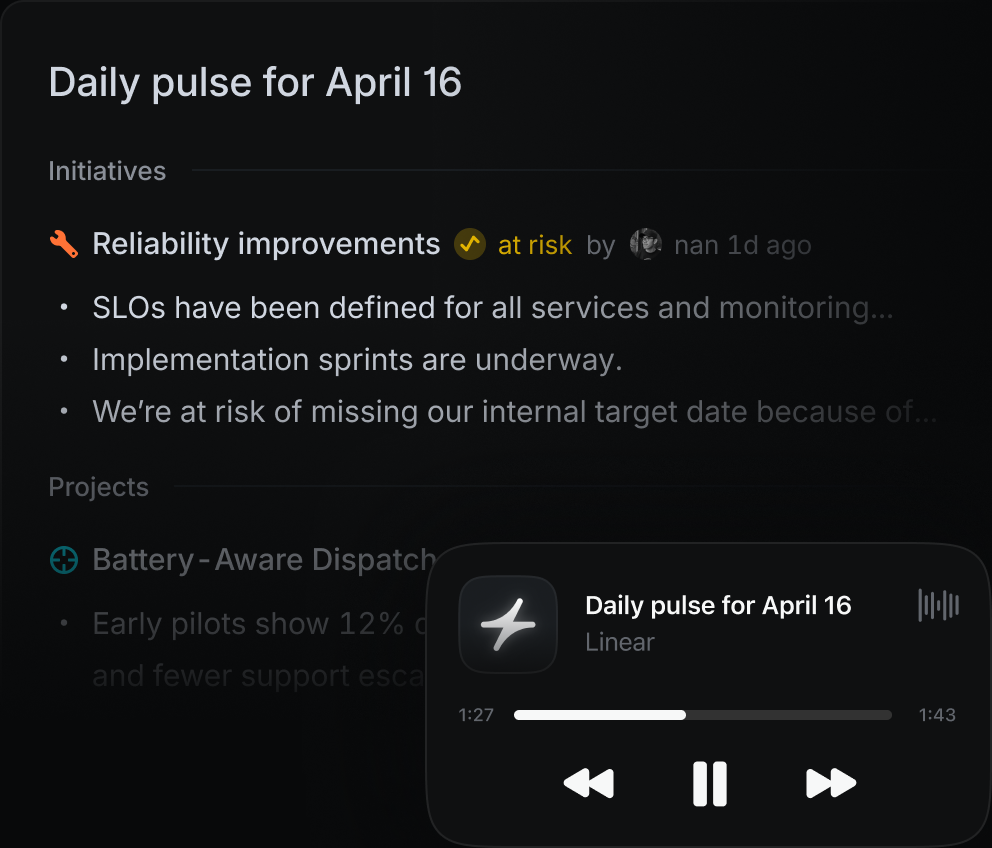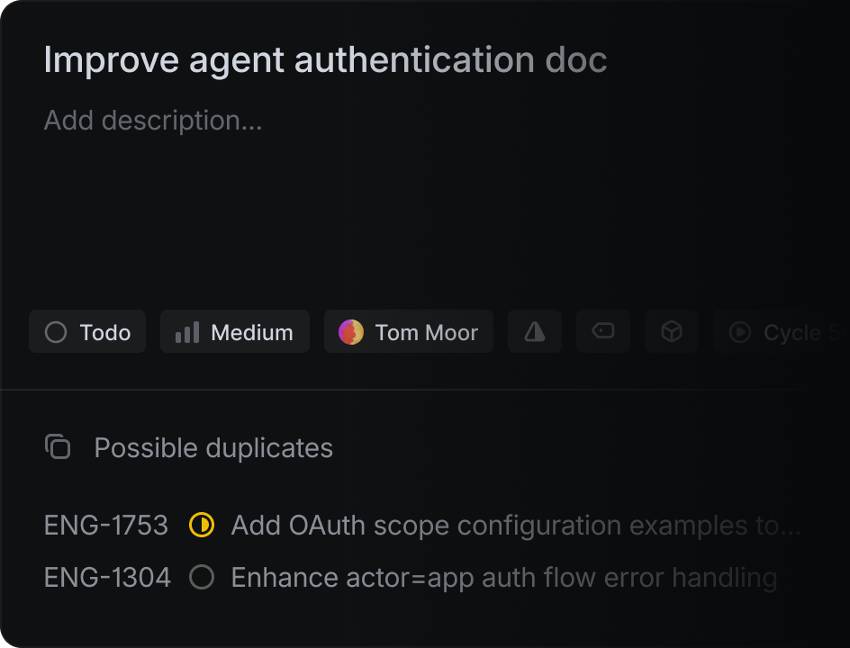 Deploy AI agents that work just like your human team. Creating issues, updating statuses, and handling tasks that used to consume engineering time.
