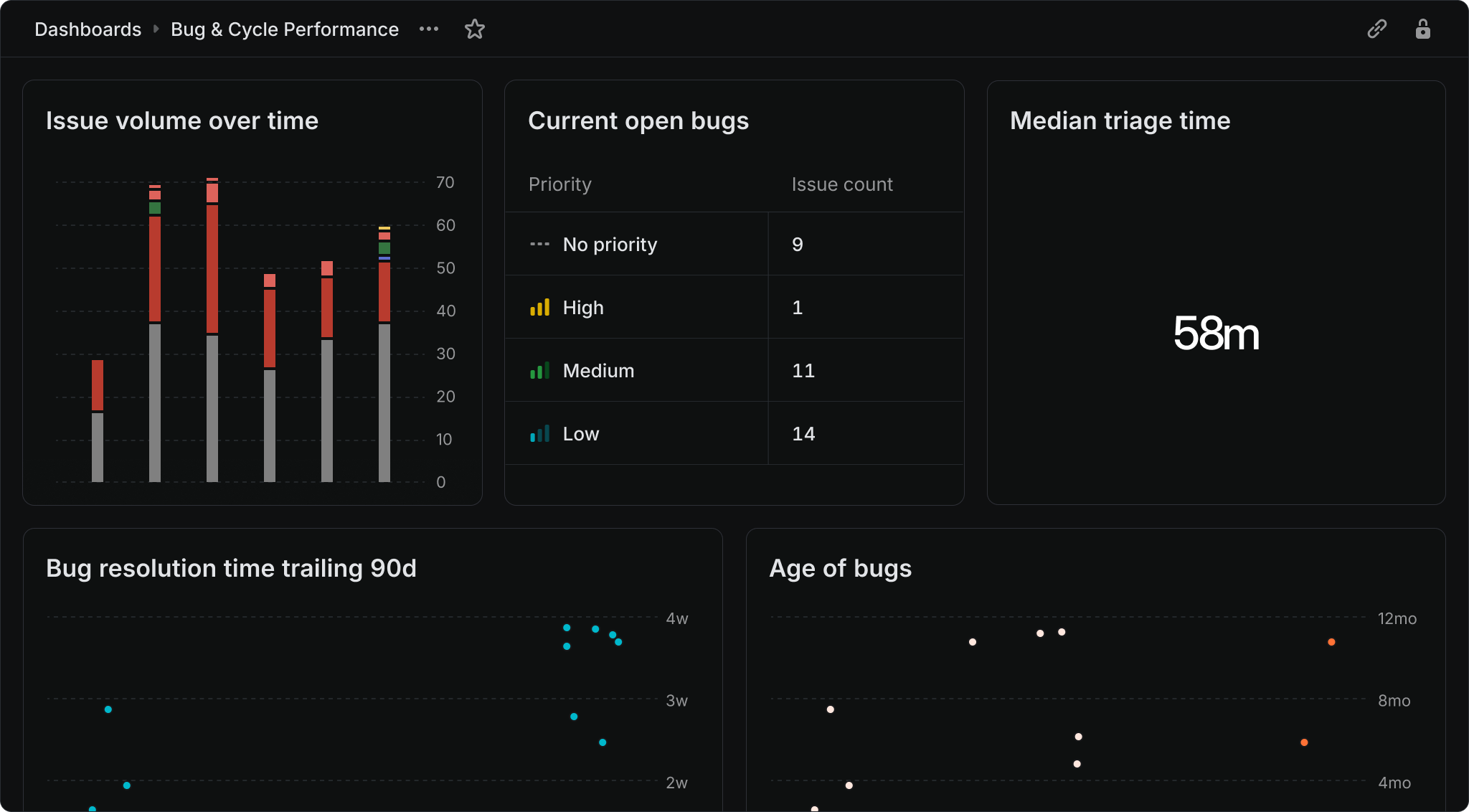 Build custom dashboards for every team.From ongoing product operations to one-off research reports, dashboards provide a single page view to monitor and analyze key metrics.
