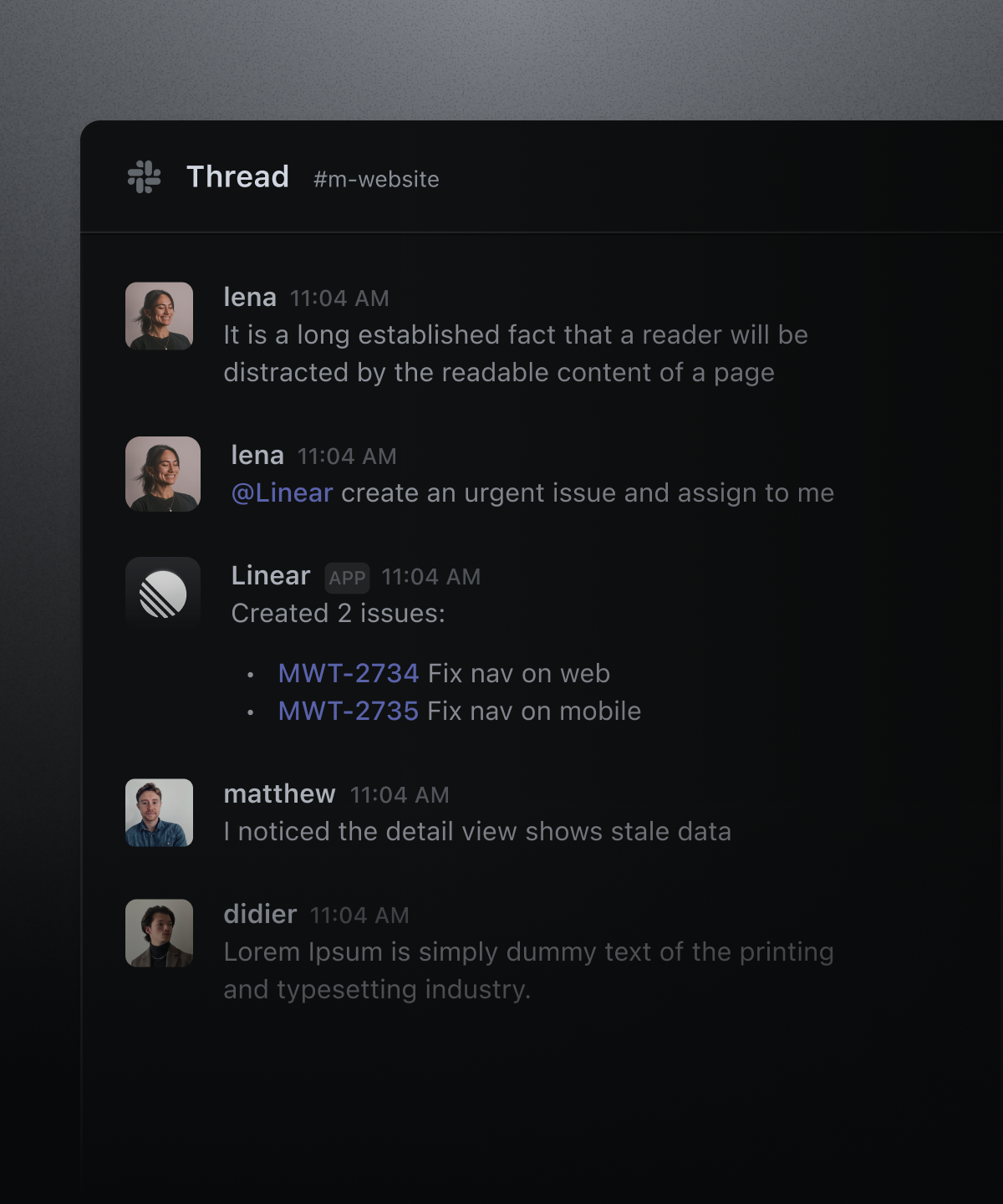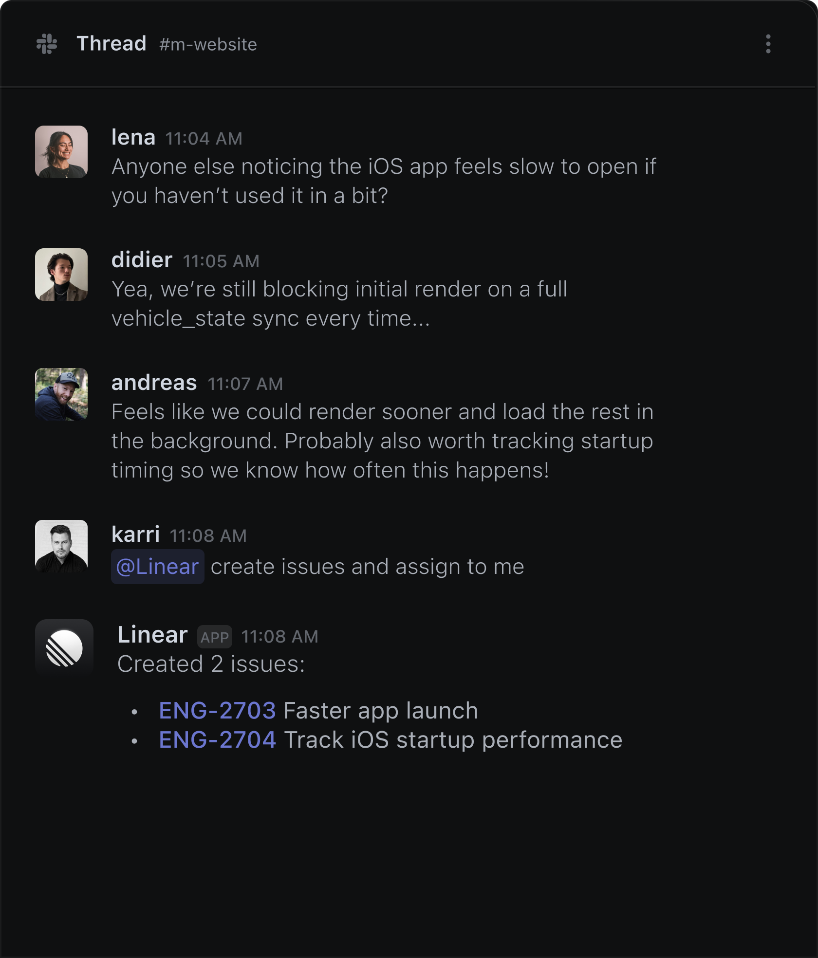 Turn Slack threads into issues and assign them directly to a coding agent. No handoffs required.