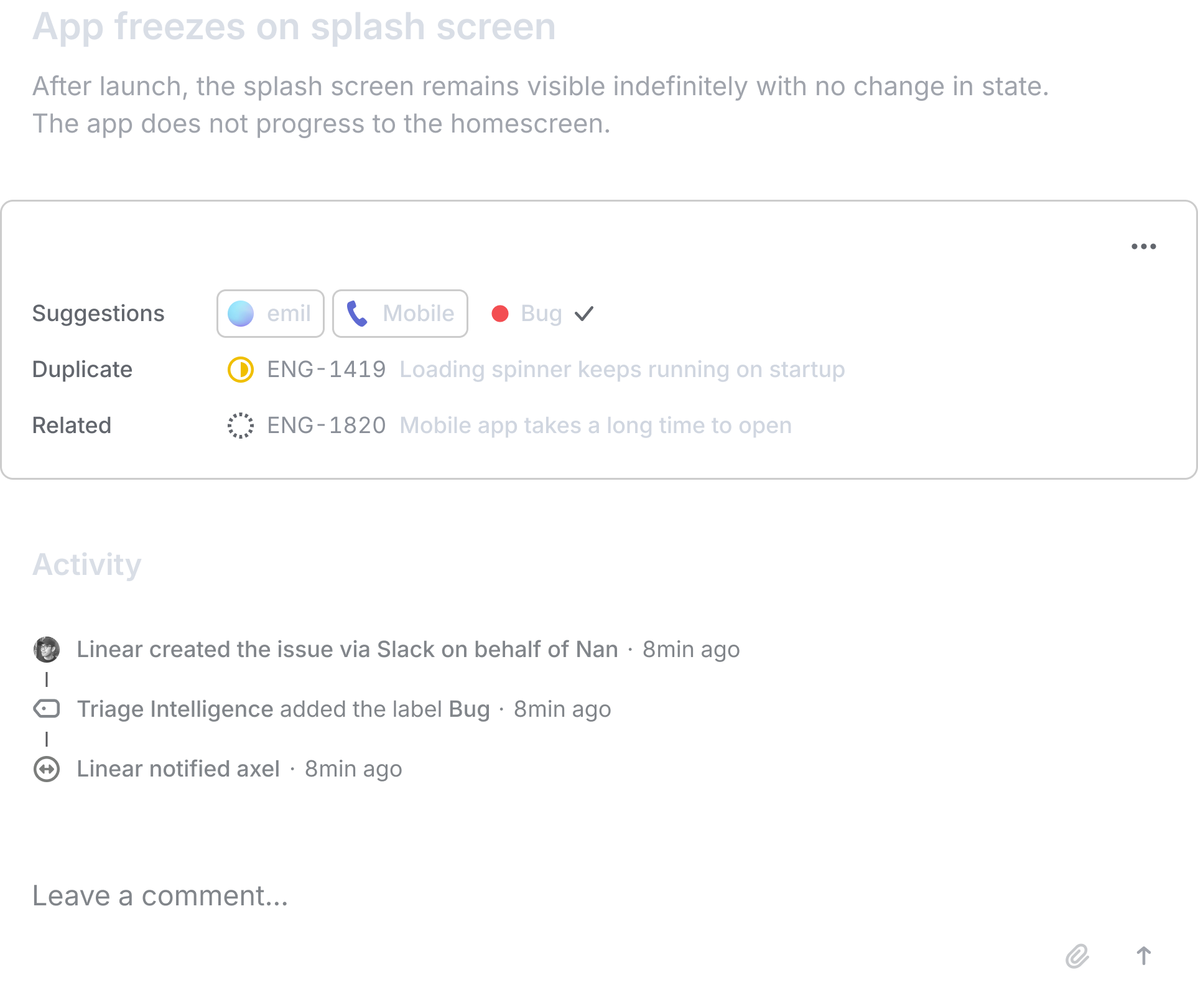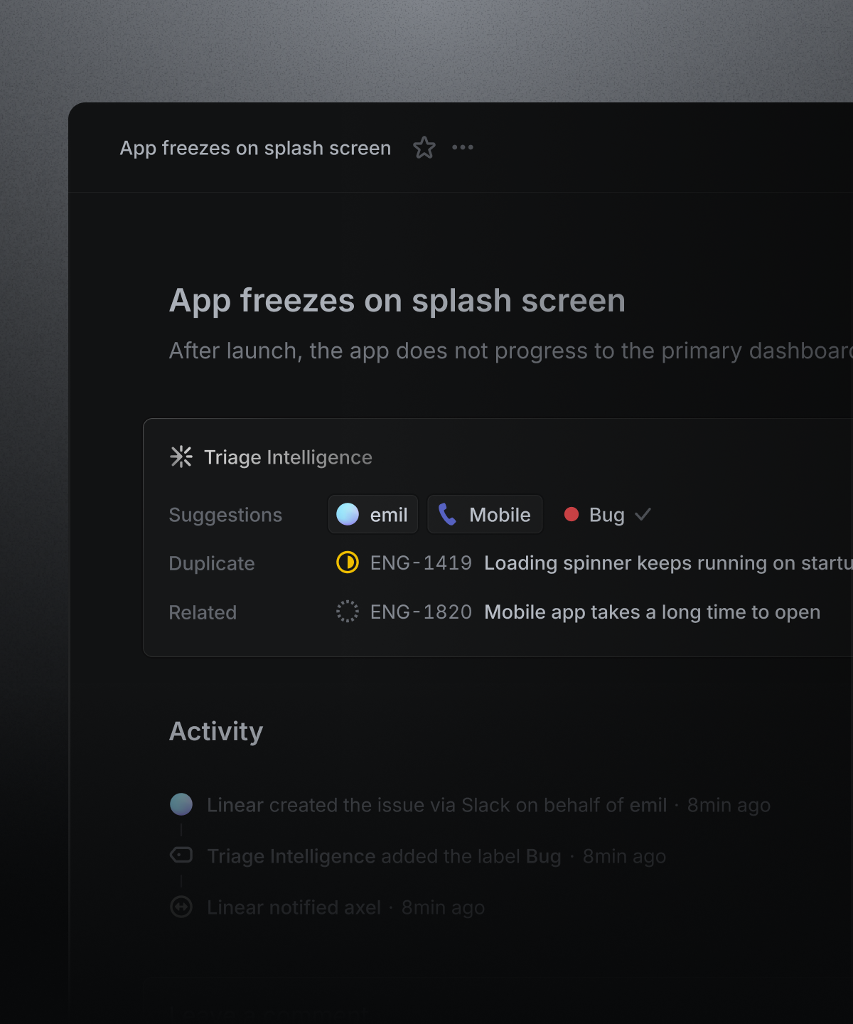 Triage Intelligence proactively suggests and applies the right assignees, teams, projects, and labels based on your team's historical patterns.