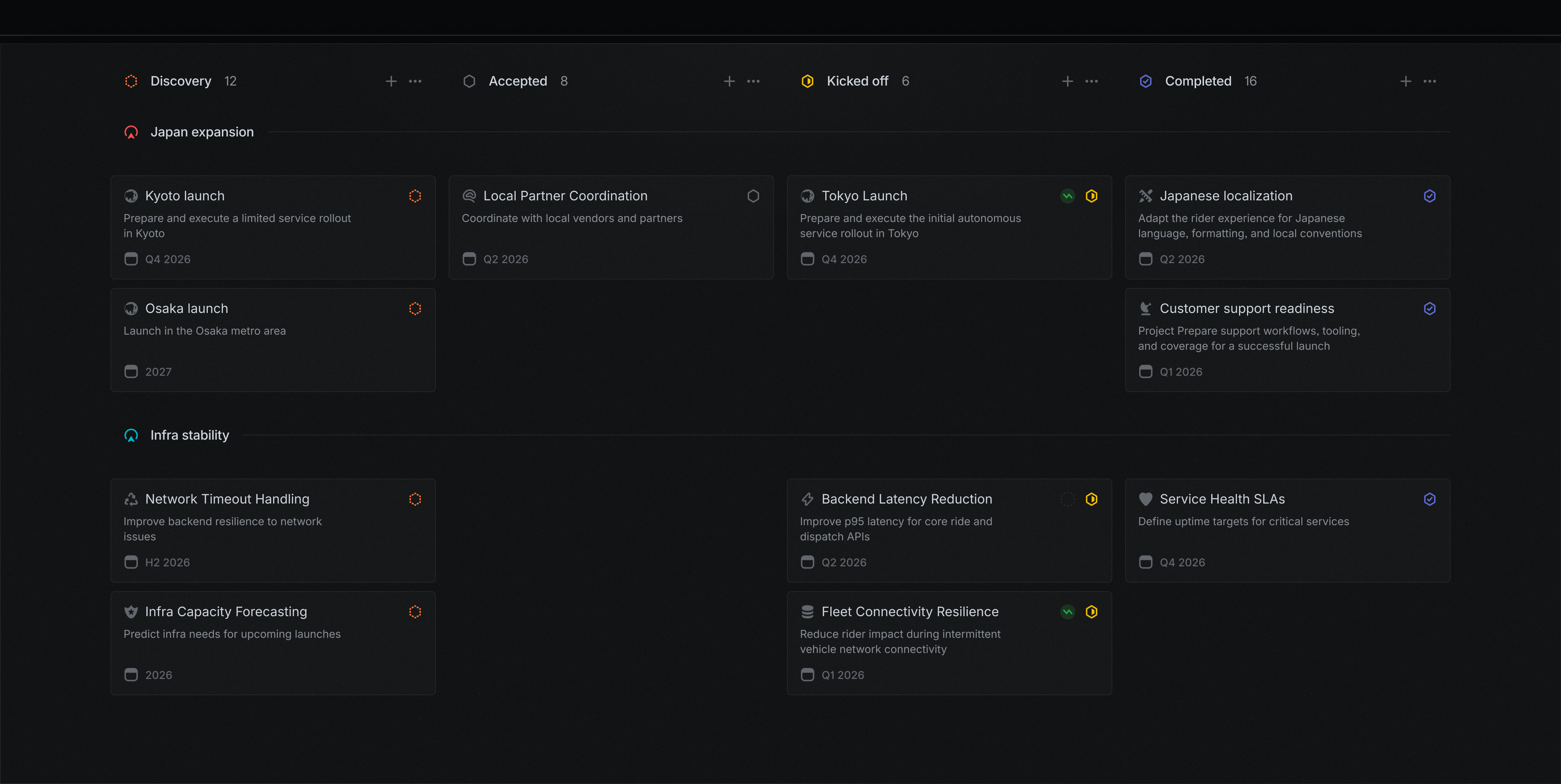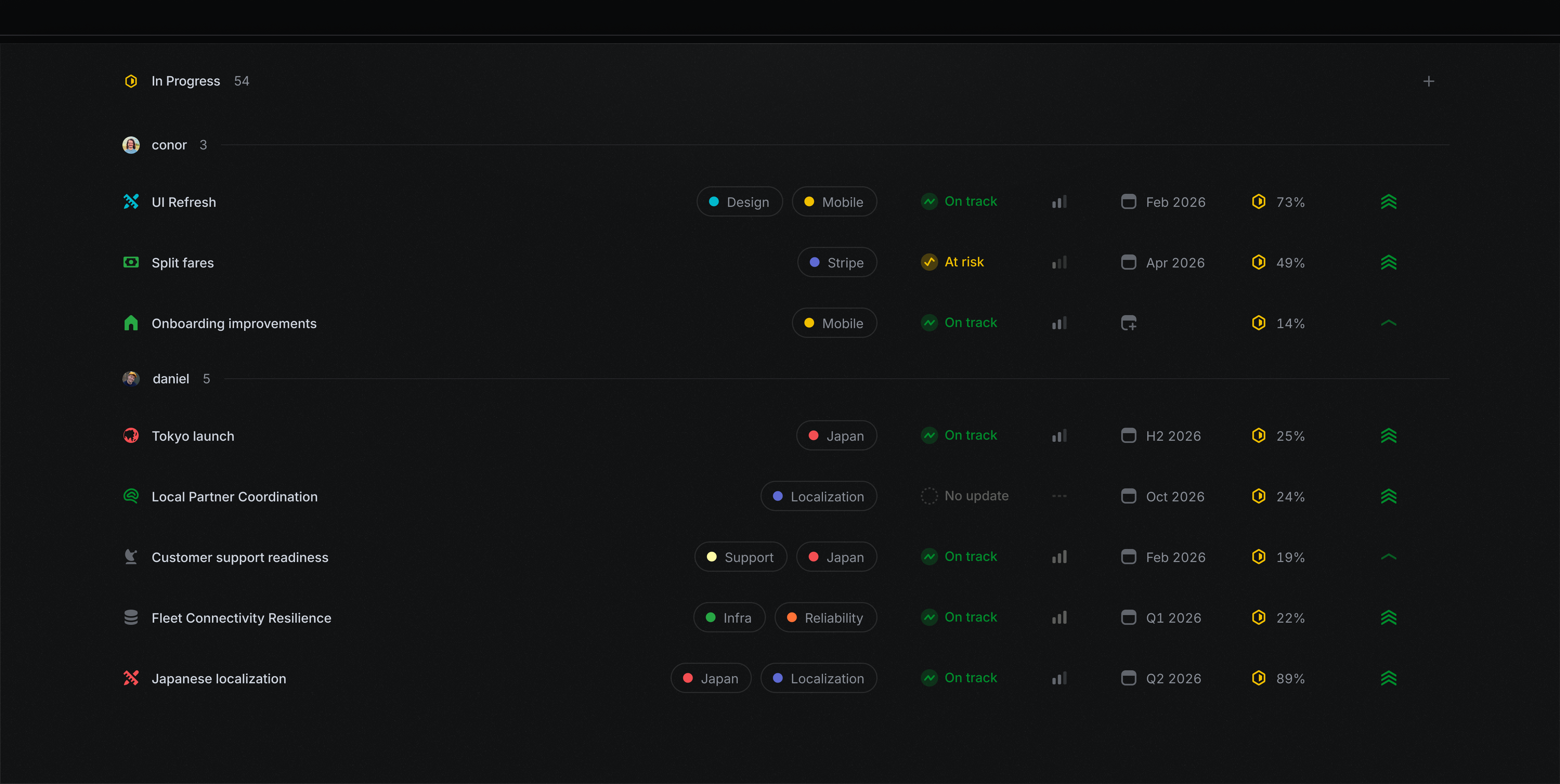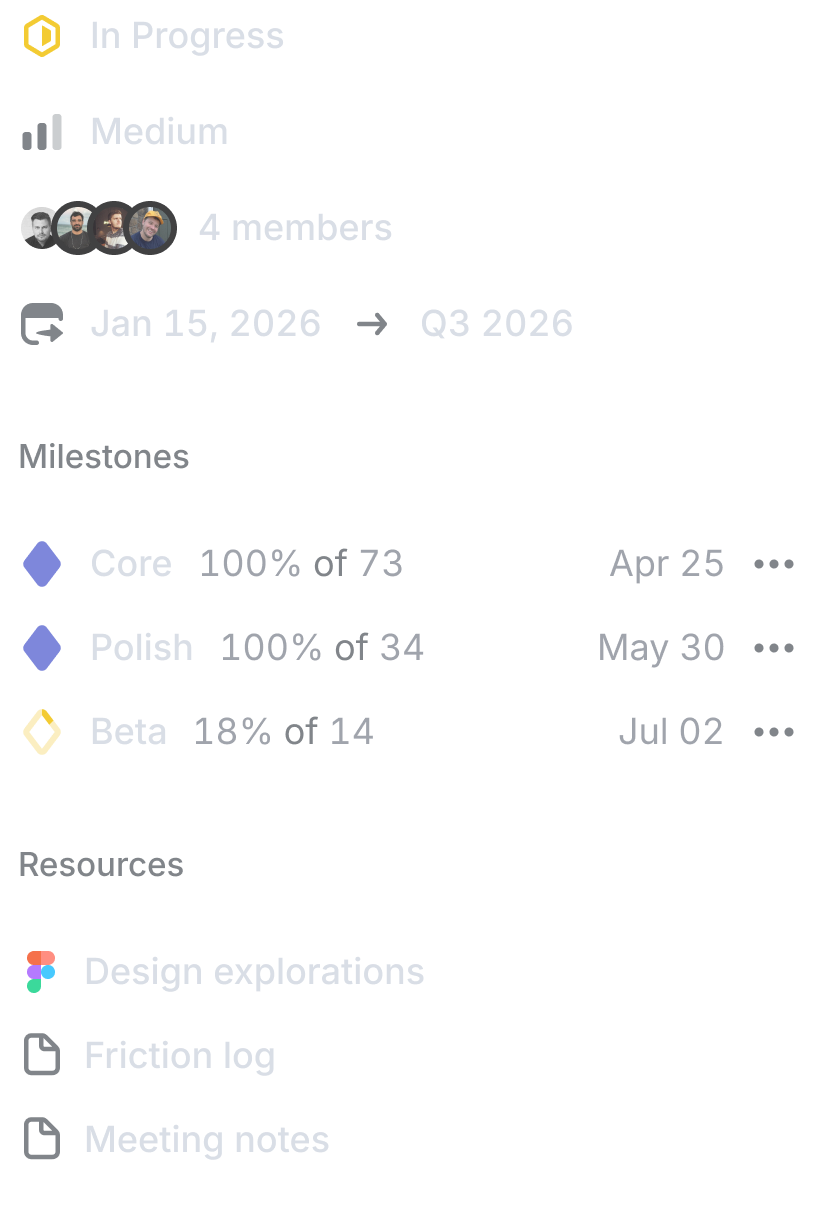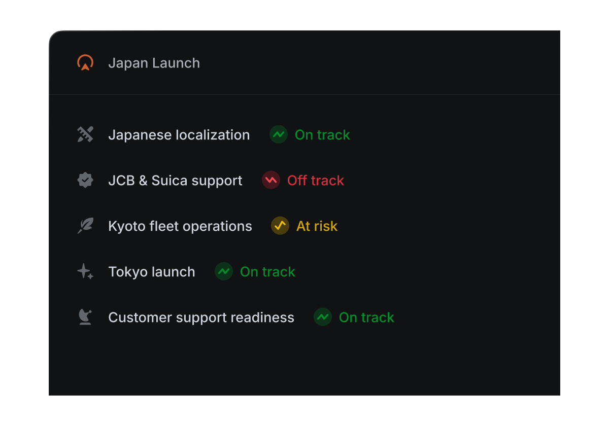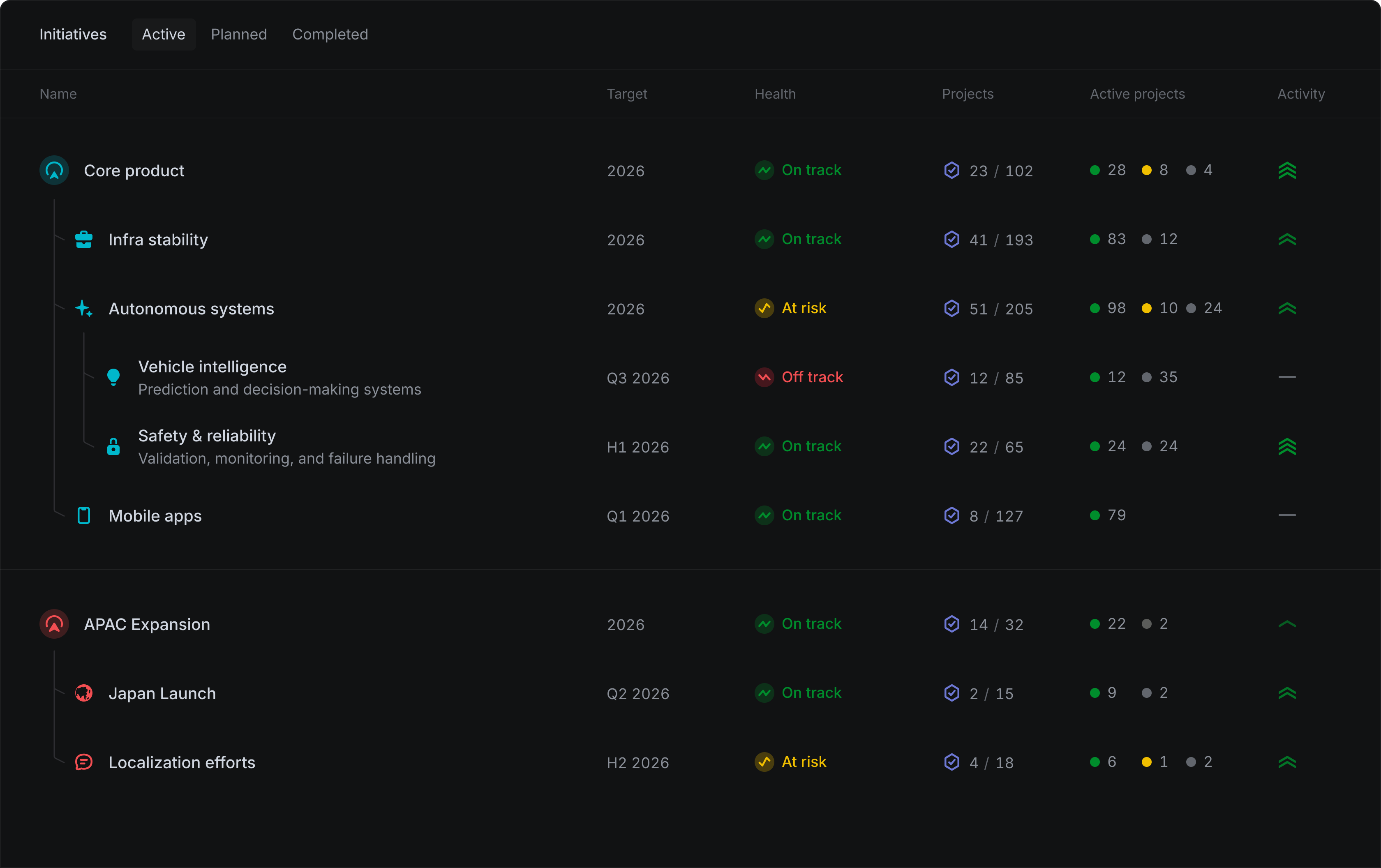 Align projects into larger, strategic product efforts. Express the most important streams of work in your company and how they are progressing.