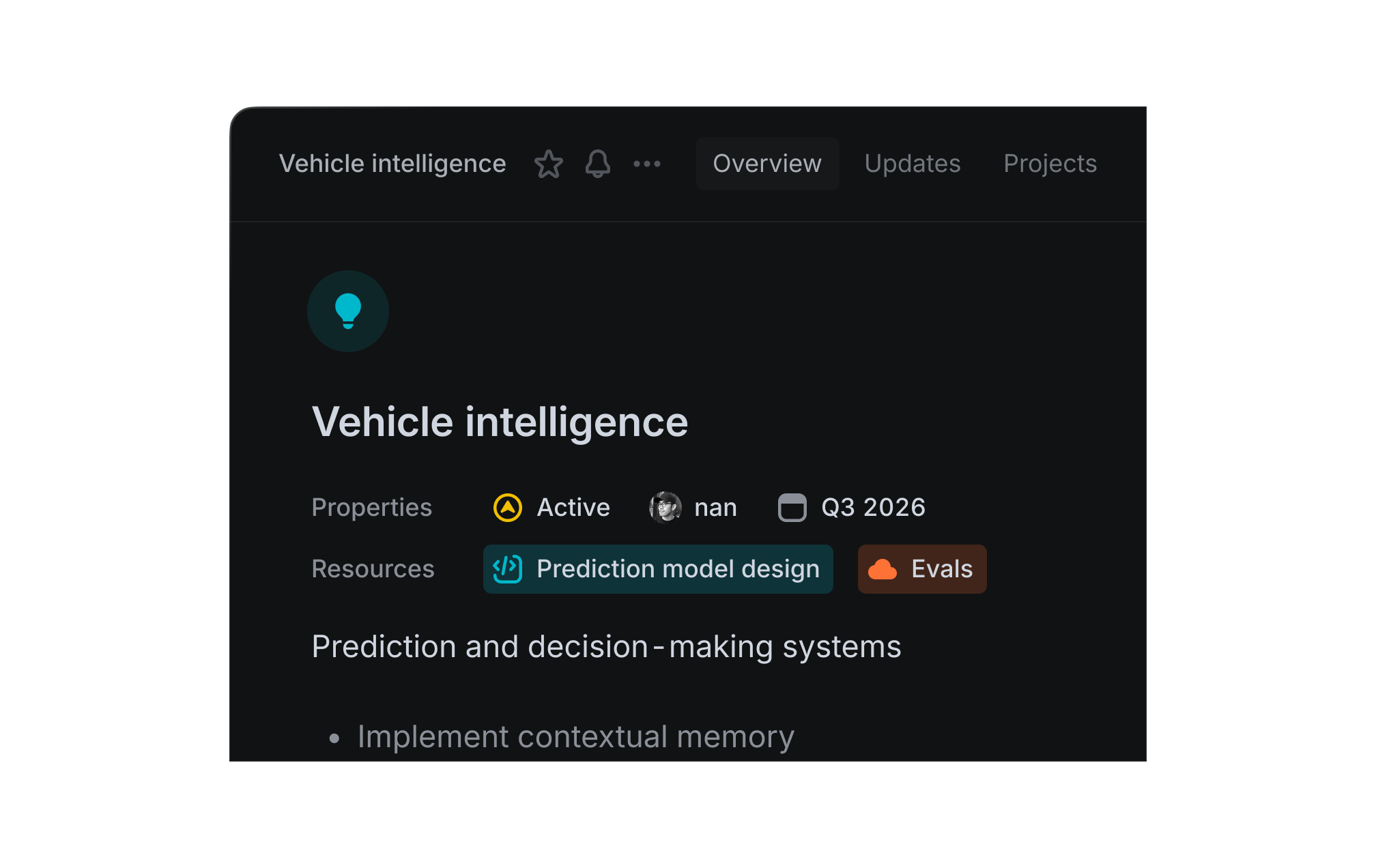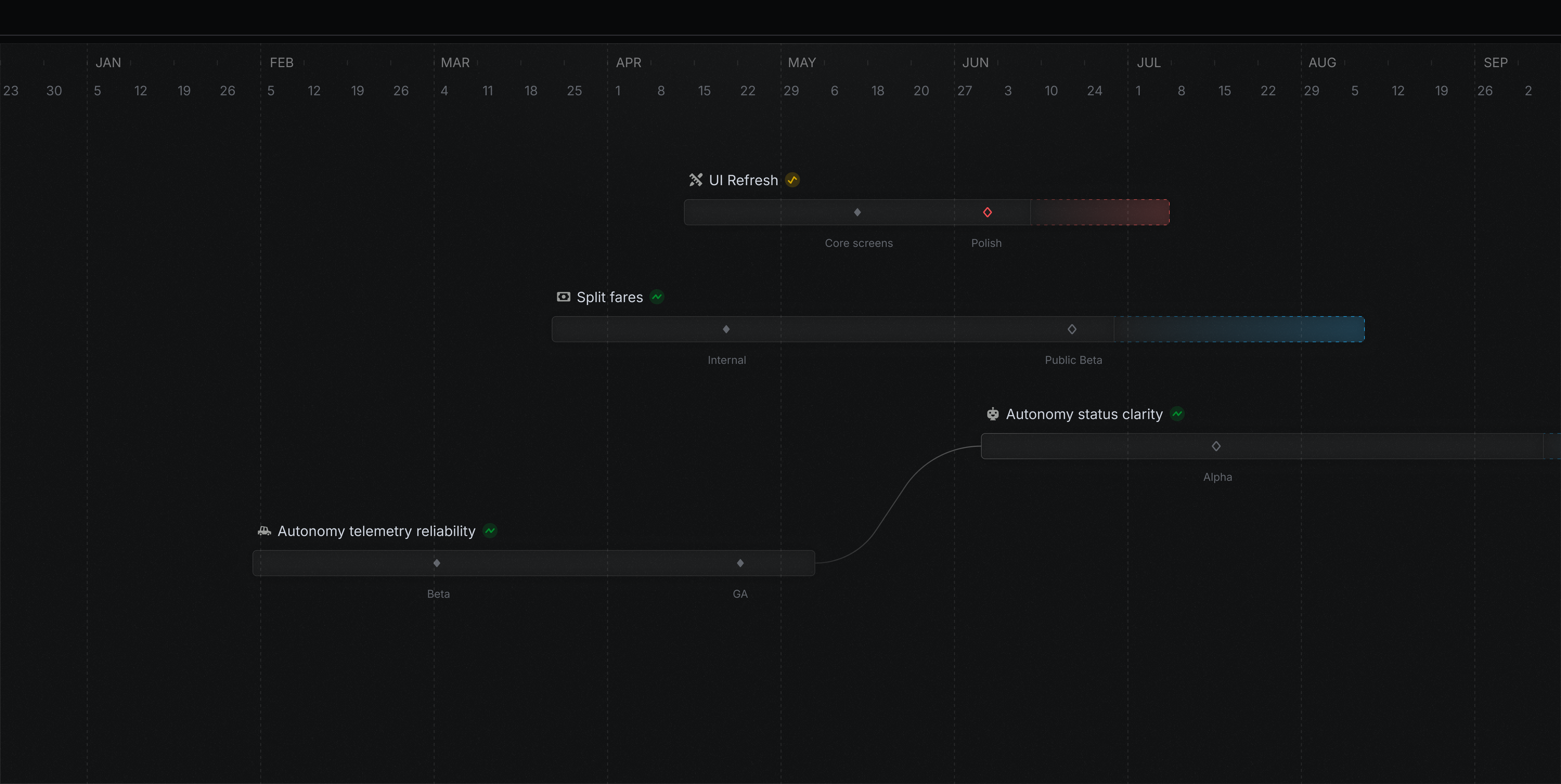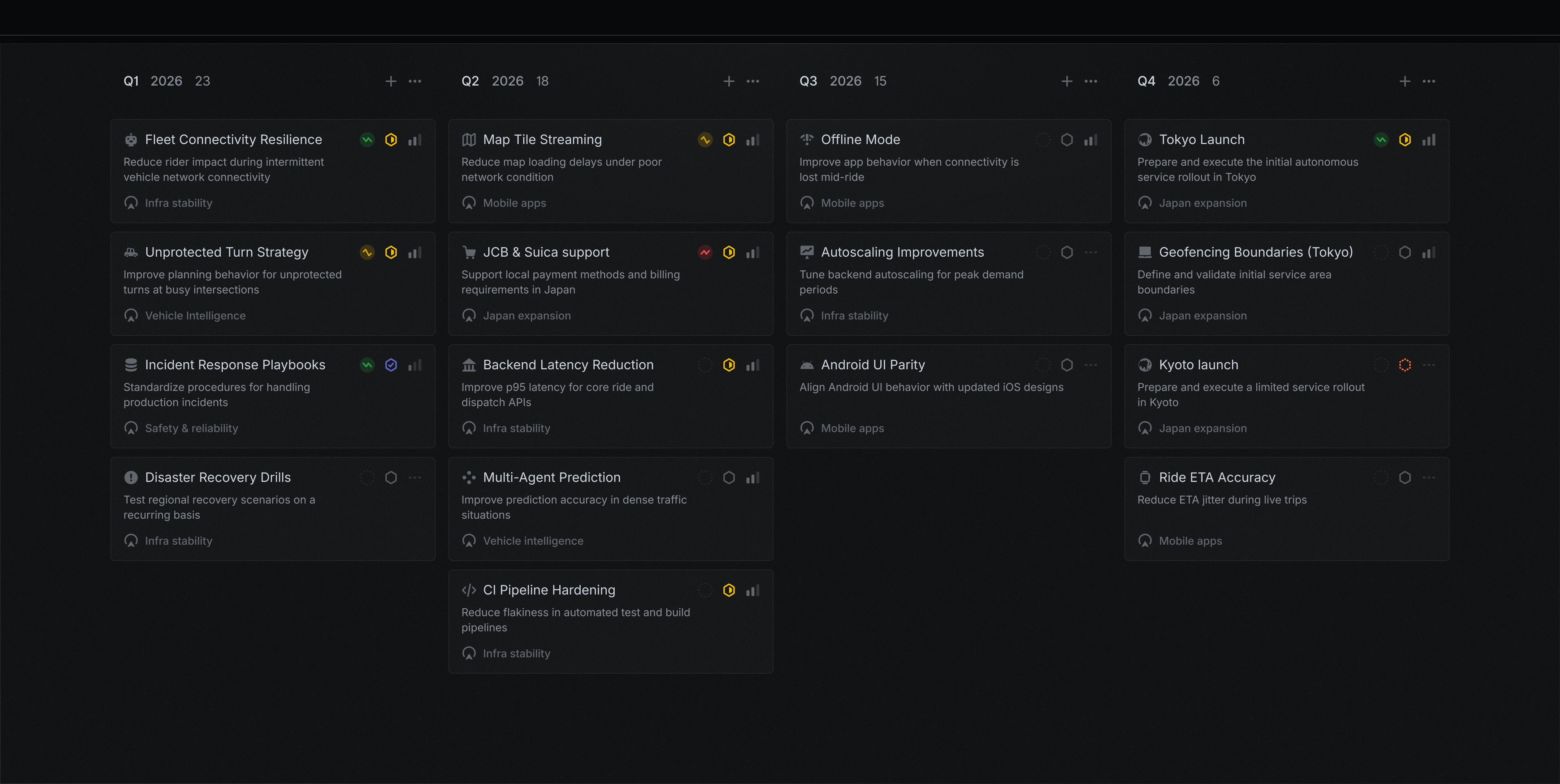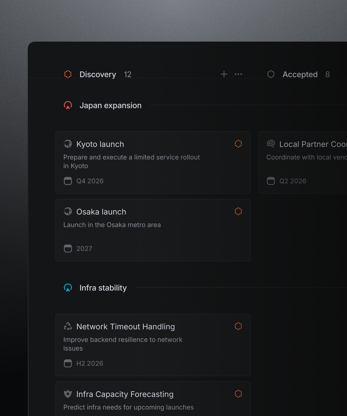 Align projects into larger, strategic product efforts. Express the most important streams of work in your company and how they are progressing.