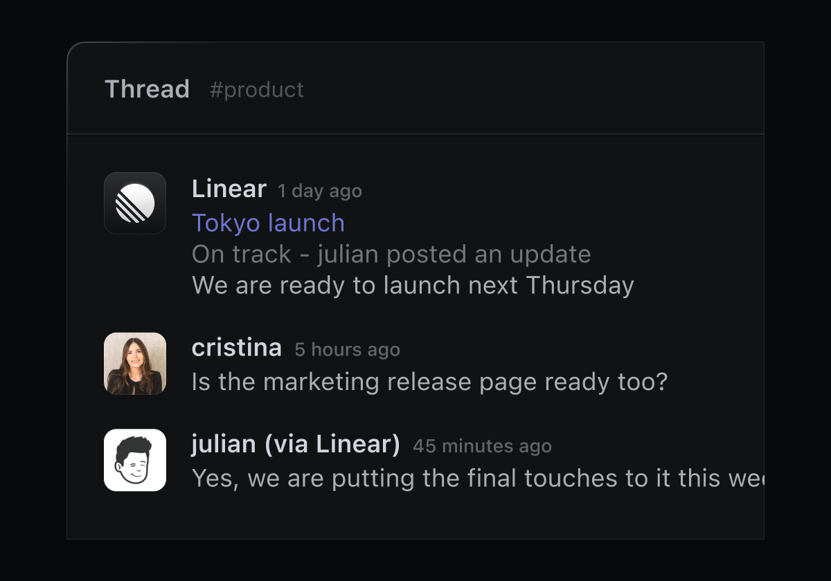 Automatically share project updates on Slack with bi-directionally synced comment threads.