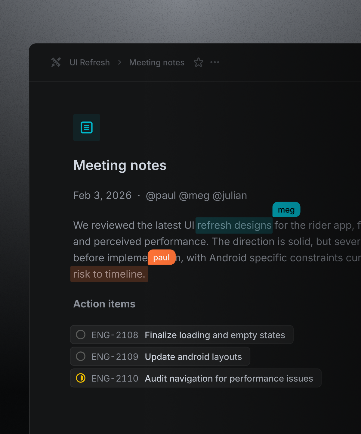 Coordinate larger pieces of work across multiple people and teams. Seamlessly move between ideation and execution.